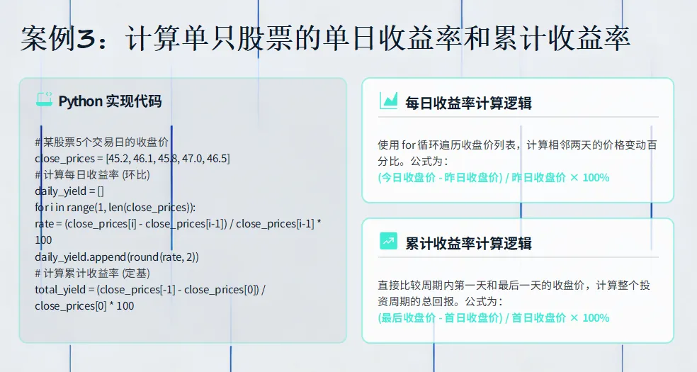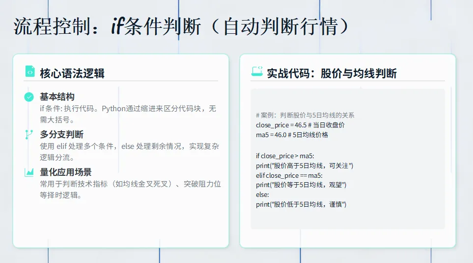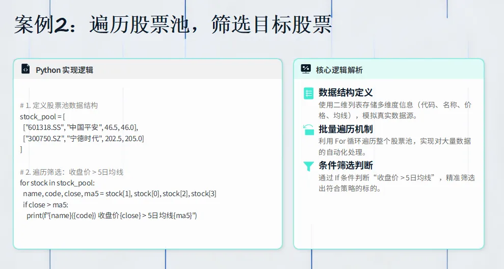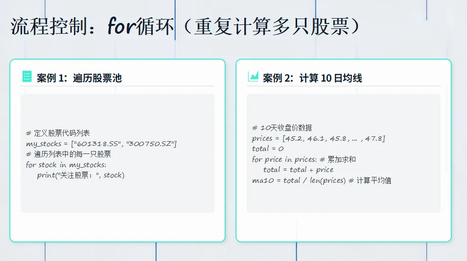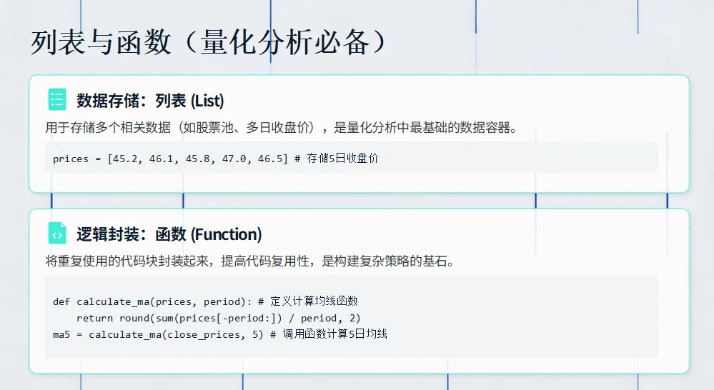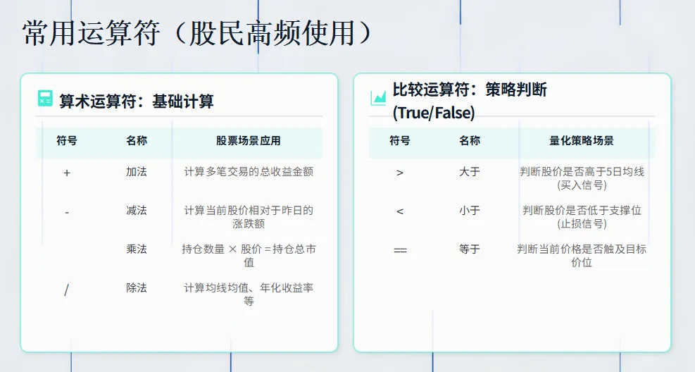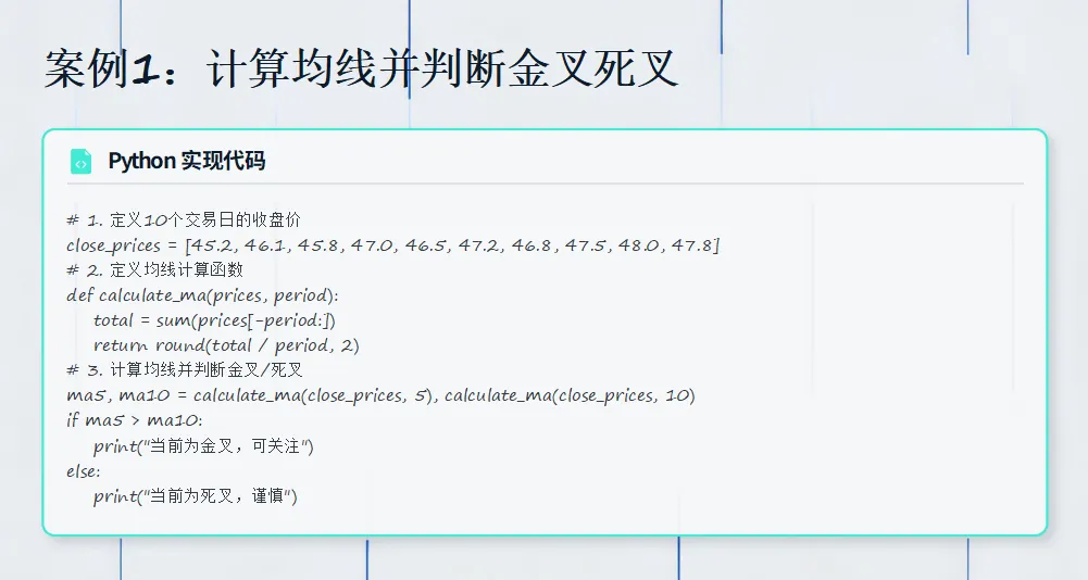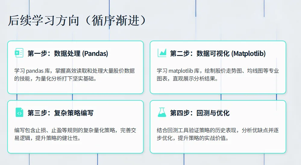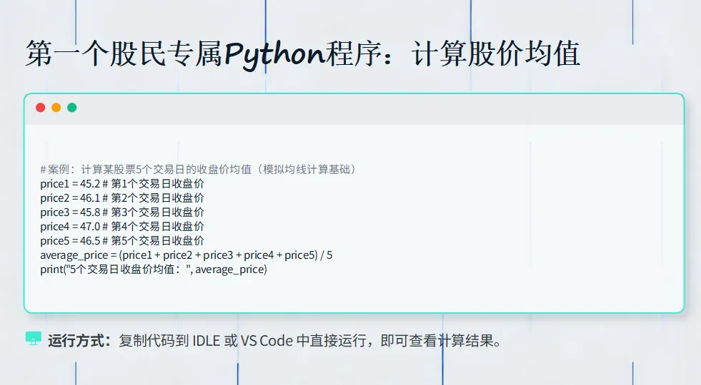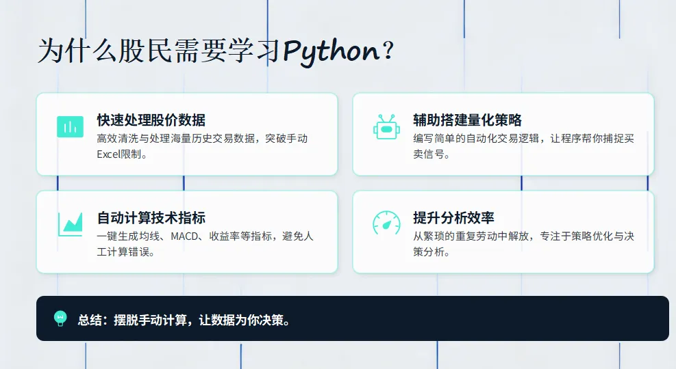 股民并非必须学 Python,但 Python 会成为高效做股票分析、进阶量化决策的实用工具。如果你的炒股方式是轻量分析、少量持股、纯手动决策,炒股软件现成指标、选股器、行情图就能满足需求,那学 Python 就是额外的时间成本,完全没必要。 如果你的炒股方式是重数据、批量分析、想做策略回测 / 自动化复盘,靠手动计算 / 筛选会耗费大量时间,甚至做不到精准分析,那 Python 会成为你的「效率神器」。 本教程专为股民设计,无需编程基础,全程结合股票、量化分析场景讲解Python基础,学完就能上手简单的股价分析、均线计算等操作。 股民学习Python 不用像程序员一样全学,只学和股票分析相关的轻量化内容就够了,上手快、见效快:1、批量分析股票池:比如从沪深300或创业板里筛选“股价低于 20 日均线、市盈率小于 30、近 5 日涨幅超 10%”的股票,手动翻几百只股根本做不到,Python 几行代码就能一键筛选;2、摆脱手动计算:要计算多只股票 5/10/60 日均线、累计收益率、最大回撤,手动算容易出错,Python 能自动处理成百上千条股价数据,精准又省时;3、做量化策略回测:比如验证“5日线金叉10日线买入,死叉卖出”这个策略,在某只股票历史行情里是否有效,Python 能结合历史数据快速回测,比主观判断更有依据;4、做个性化分析:炒股软件指标是固定的,如果你有自己的分析逻辑例如,要结合成交量和均线的自定义选股,Python 能实现个性化指标计算和可视化;5、自动化复盘:比如每天收盘后,自动提取自选股的收盘价、涨跌幅、均线数据,生成专属复盘报表,不用手动截图记录。6、股民学 Python 不是 “编程”,而是 “高效处理股票数据”。不用学爬虫、人工智能、网页开发,只学数据处理和股票分析核心内容(就是之前专属教程里的内容:环境搭建、变量 / 列表 / 函数、pandas 基础、简单可视化),核心价值:一是提效,把手动重复工作计算、筛选、复盘交给代码,节省大量时间,把精力放在决策上;二是精准,避免手动计算统计误差,处理海量数据更准确,比如分析一只股票5年的日线数据,手动算均线根本不现实,Python 一键搞定;三是从主观凭感觉炒股升级为靠数据和策略做决策。7、股民掌握PYTHON基础后,逐步进阶学习应用,重点围绕“股票量化分析”展开,不学无关内容。pandas(核心工具),用于读取、处理大量股价数据(如从Excel导入收盘价,自动计算均线);matplotlib,用于绘制股价走势图、均线图,直观查看行情;量化策略编写(如之前的均线金叉/死叉策略),实现自动判断买卖信号;结合股票回测工具,验证策略的有效性,逐步优化。无需追求“高深”,重点是“实用”,能帮你高效分析股票、辅助决策即可。