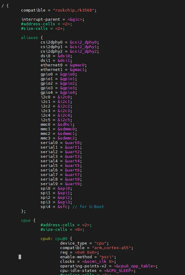 .dts / .dtsi │ ▼dtc (Device Tree Compiler) │ ▼.dtb(二进制,Bootloader 传给内核) │ ▼内核解析 │ ▼of_* API(Open Firmware API)/dts-v1/;/ { model = "My Board Rev1"; compatible = "myvendor,myboard";. #address-cells = <1>; #size-cells = <1>; cpus { #address-cells = <1>; #size-cells = <0>; cpu@0 { compatible = "arm,cortex-a53"; reg = <0>; }; }; soc { uart0: serial@10000000 { compatible = "ns16550a"; reg = <0x10000000 0x100>; interrupts = <0 4 4>; clocks = <&clk_uart>; status = "okay"; }; };};