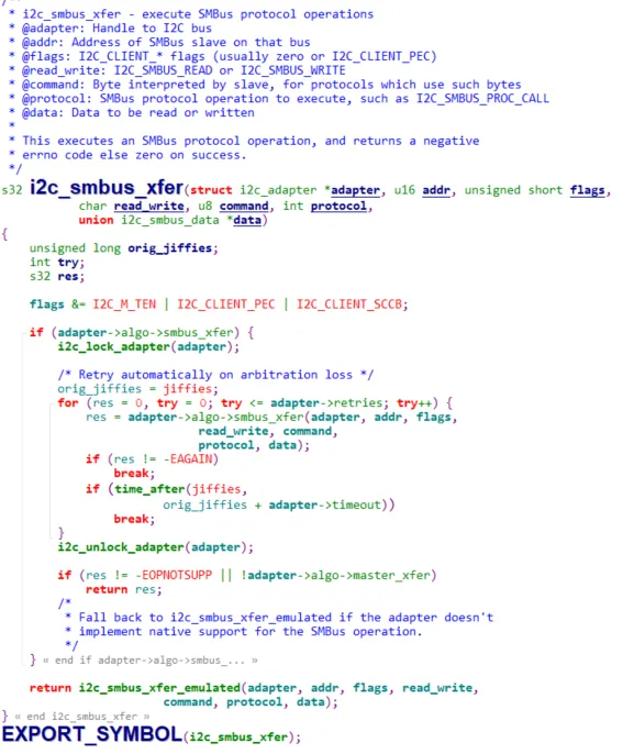 // SMBus 读字节(等价于单寄存器读)int i2c_smbus_read_byte(struct i2c_client *client, u8 reg) { int ret = i2c_smbus_read_byte_data(client, reg); if (ret < 0) { dev_err(&client->dev, "SMBus读字节失败,reg=0x%02x\n", reg); return ret; } return ret; // 返回读取的字节值}// SMBus 写字节int i2c_smbus_write_byte(struct i2c_client *client, u8 reg, u8 val) { int ret = i2c_smbus_write_byte_data(client, reg, val); if (ret < 0) { dev_err(&client->dev, "SMBus写字节失败,reg=0x%02x\n", reg); } return ret;}//其中 /** * i2c_smbus_read_byte_data - SMBus "read byte" protocol * @client: Handle to slave device * @command: Byte interpreted by slave * * This executes the SMBus "read byte" protocol, returning negative errno * else a data byte received from the device. */s32 i2c_smbus_read_byte_data(const struct i2c_client *client, u8 command){ union i2c_smbus_data data; int status; status = i2c_smbus_xfer(client->adapter, client->addr, client->flags, I2C_SMBUS_READ, command, I2C_SMBUS_BYTE_DATA, &data);return (status < 0) ? status : data.byte;}EXPORT_SYMBOL(i2c_smbus_read_byte_data);/** * i2c_smbus_write_byte_data - SMBus "write byte" protocol * @client: Handle to slave device * @command: Byte interpreted by slave * @value: Byte being written * * This executes the SMBus "write byte" protocol, returning negative errno * else zero on success. */s32 i2c_smbus_write_byte_data(const struct i2c_client *client, u8 command, u8 value){ union i2c_smbus_data data;data.byte = value;return i2c_smbus_xfer(client->adapter, client->addr, client->flags, I2C_SMBUS_WRITE, command, I2C_SMBUS_BYTE_DATA, &data);}EXPORT_SYMBOL(i2c_smbus_write_byte_data);