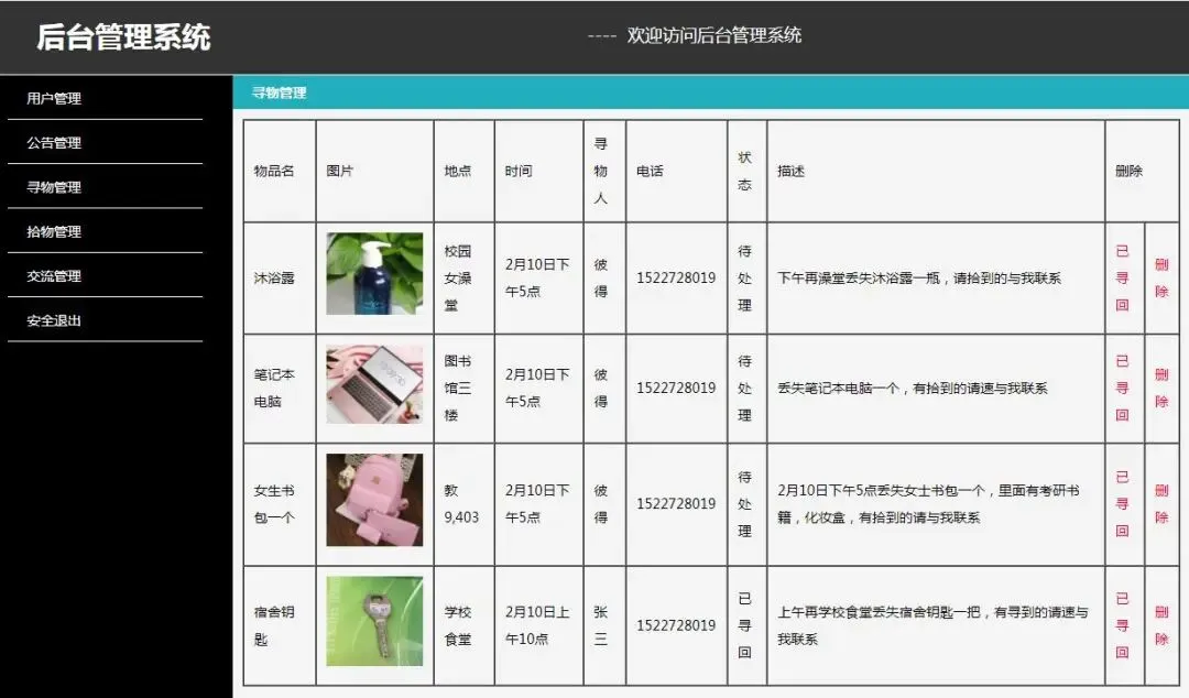 4.寻物管理 查看 删除 操作(寻回) (物品名 图片 地点 时间 寻物人 电话 状态)