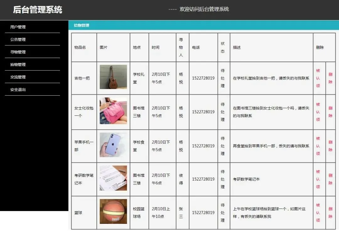 5.拾物管理 查看 删除 操作(被认领)(物品名 图片 地点 时间 寻物人 电话 状态)