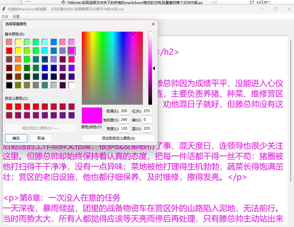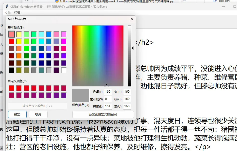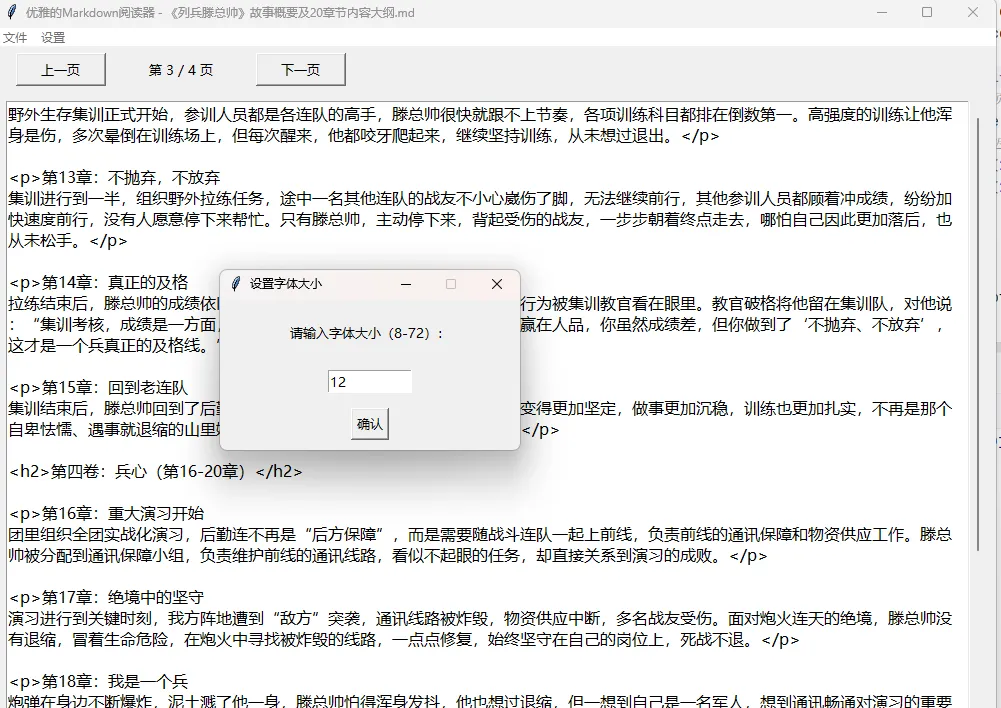 用Python的tkinter库制作一个美观的Markdown阅读器,核心功能包括导入md文件、设置字体大小/颜色/背景色,以及上一页、下一页的翻页功能。