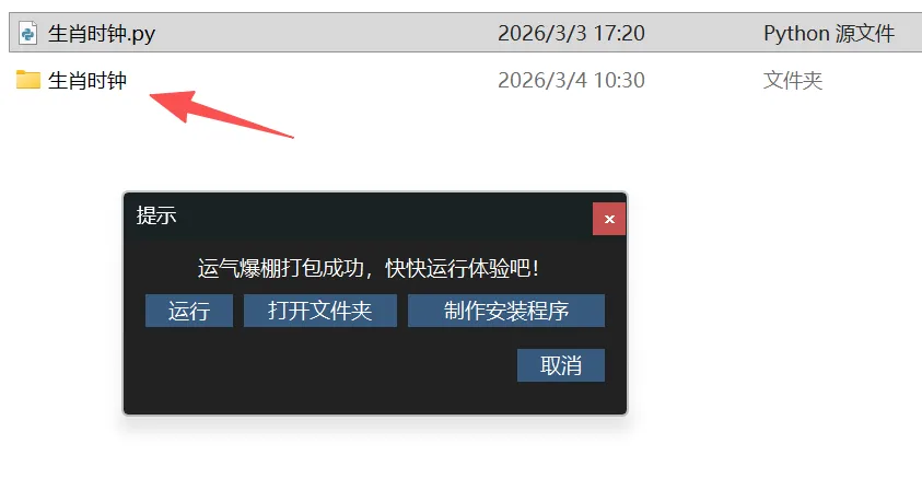 如果保持默认打包成目录,成功后就可以看到一个对应的文件夹。 点击“打开文件夹”,就可以看到打包成的EXE文件。 如果需要打包成独立的EXE,则在打包界面点选“打包成文件”再打包即可。 我第一次用的时候都愣住了,心想:这就完了?不用等进度条?不用看那些花花绿绿的日志?结果还真就完了,打包好的exe双击就能跑,啥毛病没有。