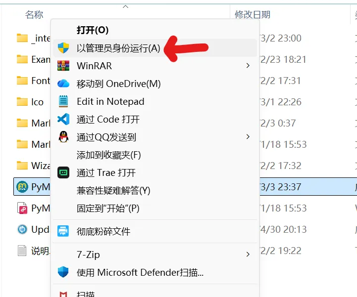 2.在PyMe.exe上鼠标右键,以管理员身份运行。