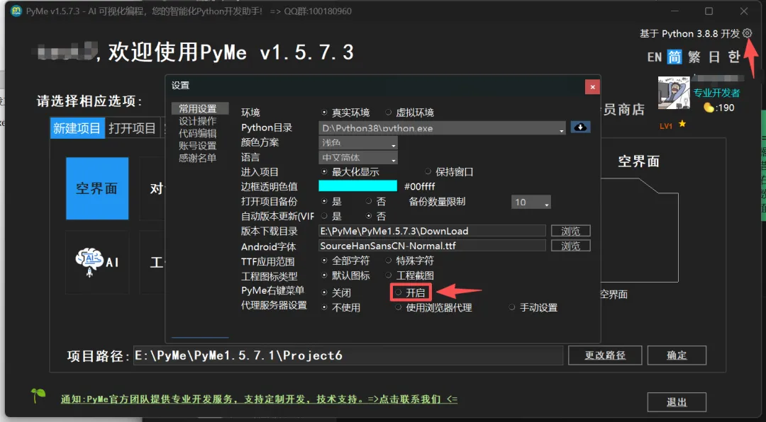 4.登录后,点击右上角的齿轮设置图标,进入设置面板,在“常用设置”里找到“PyMe右键菜单”项,点选“开启”,就可以了!