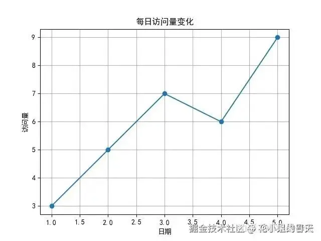 importmatplotlib.pyplotaspltplt.rcParams['font.family']='SimHei'# 黑体支持中文x=[1,2,3,4,5]y=[3,5,7,6,9]plt.plot(x,y,marker='o')plt.title('每日访问量变化')plt.xlabel('日期')plt.ylabel('访问量')plt.grid(True)plt.show()