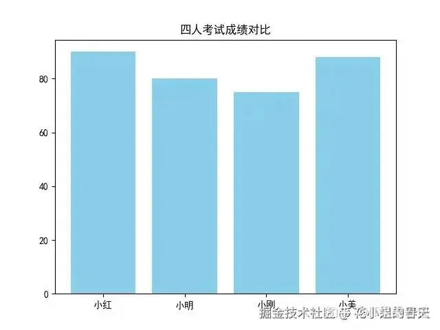 importmatplotlib.pyplotaspltplt.rcParams['font.family']='SimHei'# 黑体支持中文categories=['小红','小明','小刚','小美']scores=[90,80,75,88]plt.bar(categories,scores,color='skyblue')plt.title('四人考试成绩对比')plt.show()