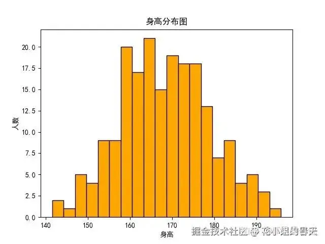 importmatplotlib.pyplotaspltimportnumpyasnpplt.rcParams['font.family']='SimHei'# 黑体支持中文data=np.random.normal(170,10,200)plt.hist(data,bins=20,color='orange',edgecolor='black')plt.title('身高分布图')plt.xlabel('身高')plt.ylabel('人数')plt.show()