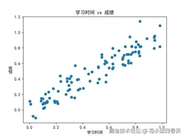 importmatplotlib.pyplotaspltimportnumpyasnpplt.rcParams['font.family']='SimHei'# 黑体支持中文x=np.random.rand(100)y=x+np.random.normal(0,0.1,100)plt.scatter(x,y)plt.title('学习时间 vs 成绩')plt.xlabel('学习时间')plt.ylabel('成绩')plt.show()