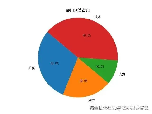 importmatplotlib.pyplotaspltplt.rcParams['font.family']='SimHei'# 黑体支持中文labels=['广告','运营','人力','技术']sizes=[30,20,10,40]plt.pie(sizes,labels=labels,autopct='%1.1f%%',startangle=140)plt.title('部门预算占比')plt.axis('equal')plt.show()