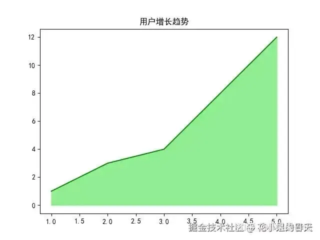 importmatplotlib.pyplotaspltplt.rcParams['font.family']='SimHei'# 黑体支持中文x=range(1,6)y=[1,3,4,8,12]plt.fill_between(x,y,color="lightgreen")plt.plot(x,y,color="green")plt.title('用户增长趋势')plt.show()
