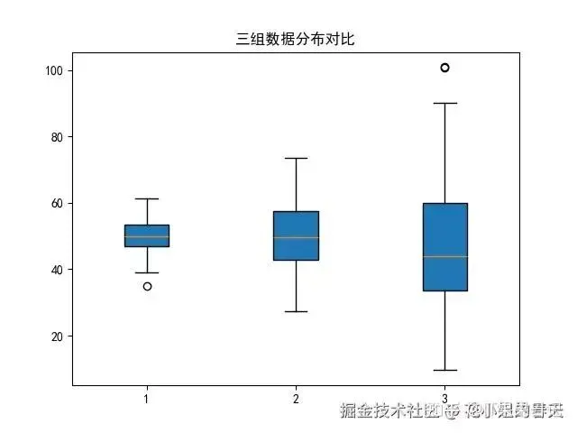importmatplotlib.pyplotaspltimportnumpyasnpplt.rcParams['font.family']='SimHei'# 黑体支持中文data=[np.random.normal(50,std,100)forstdin(5,10,20)]plt.boxplot(data,patch_artist=True)plt.title('三组数据分布对比')plt.show()
