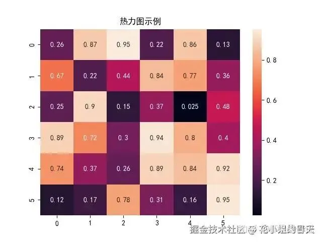 importmatplotlib.pyplotaspltimportnumpyasnpimportseabornassnsplt.rcParams['font.family']='SimHei'# 黑体支持中文data=np.random.rand(6,6)sns.heatmap(data,annot=True)plt.title('热力图示例')plt.show()