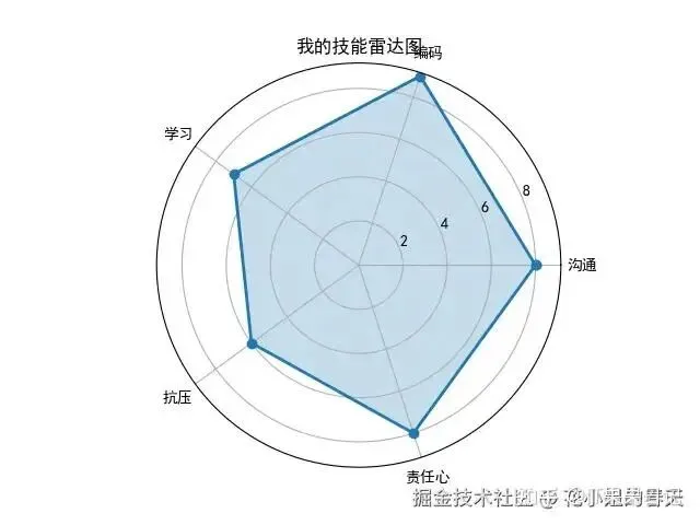 importmatplotlib.pyplotaspltimportnumpyasnpplt.rcParams['font.family']='SimHei'# 黑体支持中文labels=['沟通','编码','学习','抗压','责任心']stats=[8,9,7,6,8]angles=np.linspace(0,2*np.pi,len(labels),endpoint=False).tolist()stats+=stats[:1]angles+=angles[:1]fig,ax=plt.subplots(subplot_kw={'polar':True})ax.plot(angles,stats,'o-',linewidth=2)ax.fill(angles,stats,alpha=0.25)ax.set_thetagrids(np.degrees(angles[:-1]),labels)plt.title('我的技能雷达图')plt.show()