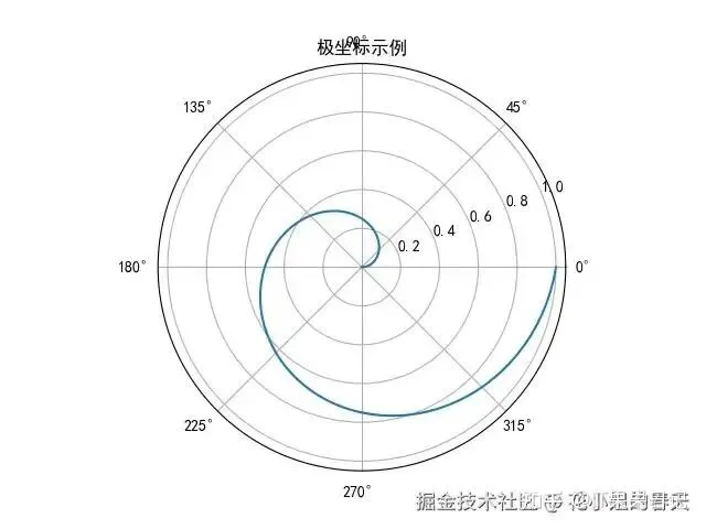 importmatplotlib.pyplotaspltimportnumpyasnpplt.rcParams['font.family']='SimHei'# 黑体支持中文r=np.linspace(0,1,100)theta=2*np.pi*rplt.polar(theta,r)plt.title('极坐标示例')plt.show()