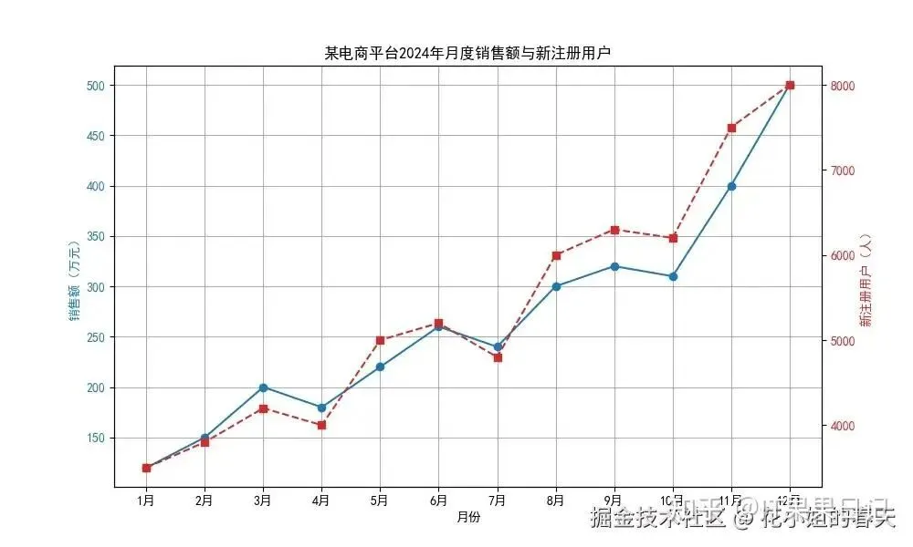importmatplotlib.pyplotaspltplt.rcParams['font.family']='SimHei'# 黑体支持中文# 数据months=['1月','2月','3月','4月','5月','6月','7月','8月','9月','10月','11月','12月']sales=[120,150,200,180,220,260,240,300,320,310,400,500]new_users=[3500,3800,4200,4000,5000,5200,4800,6000,6300,6200,7500,8000]fig,ax1=plt.subplots(figsize=(10,6))# 左轴:销售额color='tab:blue'ax1.set_xlabel('月份')ax1.set_ylabel('销售额(万元)',color=color)ax1.plot(months,sales,color=color,marker='o',label='销售额')ax1.tick_params(axis='y',labelcolor=color)# 右轴:新注册用户ax2=ax1.twinx()color='tab:red'ax2.set_ylabel('新注册用户(人)',color=color)ax2.plot(months,new_users,color=color,marker='s',linestyle='--',label='新注册用户')ax2.tick_params(axis='y',labelcolor=color)plt.title('某电商平台2024年月度销售额与新注册用户')ax1.grid(True)plt.show()