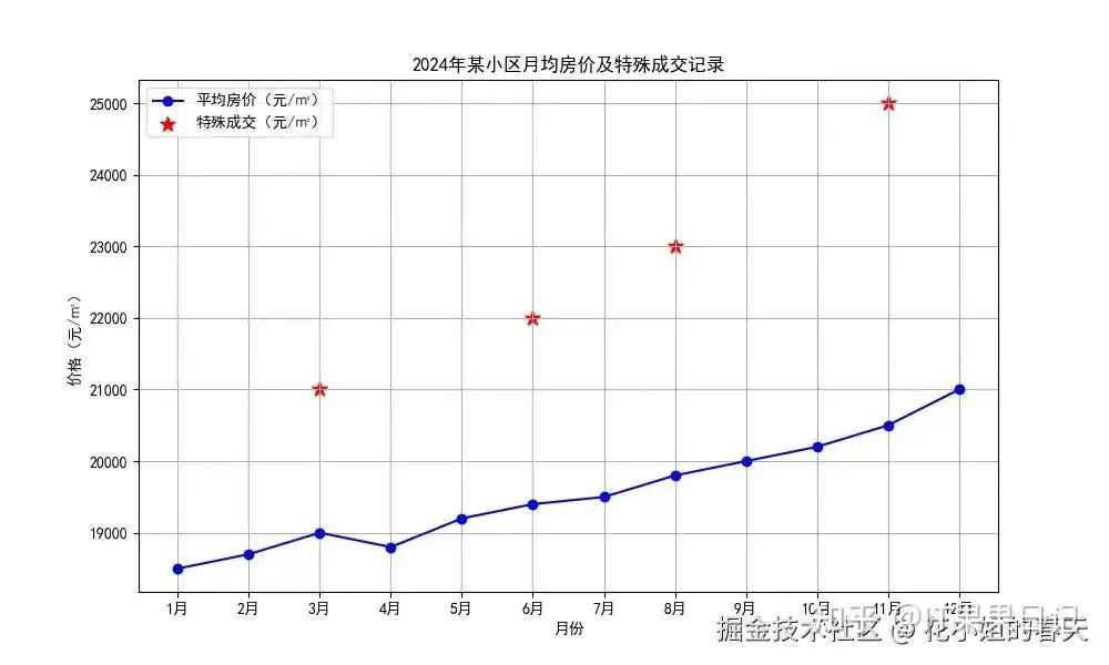 importmatplotlib.pyplotaspltplt.rcParams['font.family']='SimHei'# 黑体支持中文# 折线数据months=['1月','2月','3月','4月','5月','6月','7月','8月','9月','10月','11月','12月']avg_price=[18500,18700,19000,18800,19200,19400,19500,19800,20000,20200,20500,21000]# 散点数据special_months=['3月','6月','8月','11月']special_price=[21000,22000,23000,25000]fig,ax=plt.subplots(figsize=(10,6))# 画折线图ax.plot(months,avg_price,color='blue',marker='o',label='平均房价(元/㎡)')# 画散点图ax.scatter(special_months,special_price,color='red',s=100,marker='*',label='特殊成交(元/㎡)')plt.title('2024年某小区月均房价及特殊成交记录')plt.xlabel('月份')plt.ylabel('价格(元/㎡)')plt.legend()plt.grid(True)plt.show()