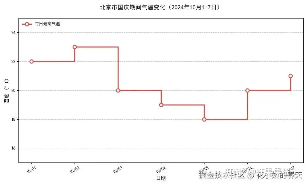importmatplotlib.pyplotaspltfromdatetimeimportdatetimeimportmatplotlib.datesasmdatesplt.rcParams['font.family']='SimHei'# 黑体支持中文# 数据dates=['2023-10-01','2023-10-02','2023-10-03','2023-10-04','2023-10-05','2023-10-06','2023-10-07']temperatures=[22,23,20,19,18,20,21]# 转换日期格式dates=[datetime.strptime(d,'%Y-%m-%d')fordindates]# 创建图表plt.figure(figsize=(10,6))# 绘制阶梯图(post样式的阶梯变化)plt.step(dates,temperatures,where='post',# 阶梯在数据点后变化color='#E64A45',# 中国红配色linewidth=2.5,marker='o',# 添加数据点标记markersize=8,markerfacecolor='white',markeredgewidth=2,label='每日最高气温')# 添加标题和标签plt.title('北京市国庆期间气温变化(2024年10月1-7日)',fontsize=14,pad=20)plt.xlabel('日期',fontsize=12)plt.ylabel('温度 (°C)',fontsize=12)# 配置坐标轴plt.gca().xaxis.set_major_formatter(mdates.DateFormatter('%m/%d'))plt.gca().xaxis.set_major_locator(mdates.DayLocator())plt.xticks(rotation=30)plt.ylim(15,25)# 添加辅助元素plt.grid(axis='y',linestyle='--',alpha=0.7)plt.tight_layout()plt.legend(loc='upper left',frameon=False)plt.show()