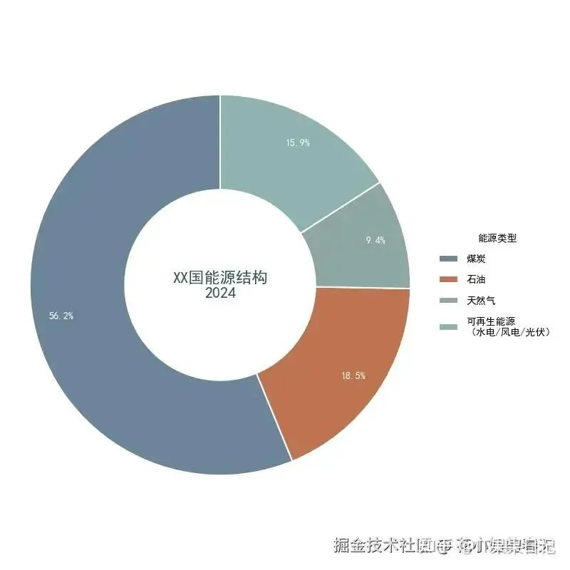 importmatplotlib.pyplotaspltplt.rcParams['font.family']='SimHei'# 黑体支持中文# 数据categories=['煤炭','石油','天然气','可再生能源\n(水电/风电/光伏)']percentages=[56.2,18.5,9.4,15.9]colors=['#6D8698',# 灰蓝(煤炭)'#BE7352',# 棕褐(石油)'#8FA6A2',# 青灰(天然气)'#8FB3B0'# 浅绿(可再生能源)]# 创建带中心洞的环形图fig,ax=plt.subplots(figsize=(8,8))wedges,texts,autotexts=ax.pie(percentages,wedgeprops={'width':0.5,# 环宽=半径的50%'edgecolor':'white',# 白色分割线'linewidth':1.5# 分割线粗细},colors=colors,startangle=90,# 起始角度(12点方向)autopct='%1.1f%%',# 百分比格式pctdistance=0.85# 百分比标签位置(0.85倍半径))# 设置百分比标签样式forautotextinautotexts:autotext.set_color('white')autotext.set_fontsize(10)autotext.set_weight('bold')# 添加中心标题ax.text(0,0,'XX国能源结构\n2024',ha='center',va='center',fontsize=16,fontweight='bold',color='#2F4F4F')# 添加图例(带透明度效果)legend=ax.legend(wedges,categories,title="能源类型",loc="center left",bbox_to_anchor=(1,0,0.5,1),frameon=False,labelspacing=1.2)legend.get_title().set_fontweight('bold')# 设置长宽比保证正圆形ax.axis('equal')plt.tight_layout()plt.show()