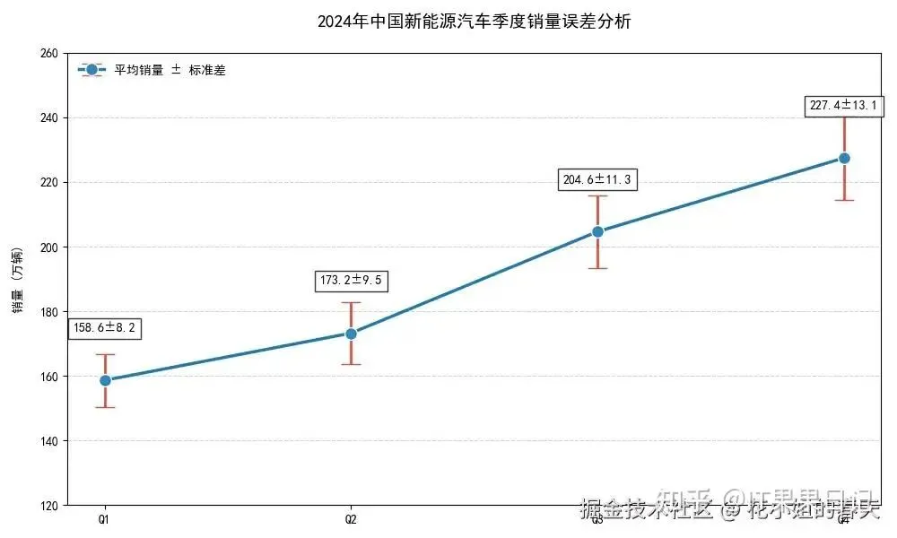 importmatplotlib.pyplotaspltplt.rcParams['font.family']='SimHei'# 黑体支持中文# 数据 (单位:万辆)quarters=['Q1','Q2','Q3','Q4']avg_sales=[158.6,173.2,204.6,227.4]# 季度平均销量std_dev=[8.2,9.5,11.3,13.1]# 各季度销量标准差# 创建带误差线的散点图plt.figure(figsize=(10,6))# 主绘图语句main_line=plt.errorbar(x=quarters,y=avg_sales,yerr=std_dev,# 误差线数据fmt='o-',# 点线组合markersize=10,markerfacecolor='#2E86C1',markeredgecolor='white',elinewidth=2,# 误差线粗细ecolor='#E74C3C',# 误差线颜色capsize=8,# 误差线顶端横杠长度linewidth=2.5,label='平均销量 ± 标准差')# 添加数据标签fori,(v,s)inenumerate(zip(avg_sales,std_dev)):plt.text(i,v+15,f'{v}±{s}',ha='center',fontsize=10,bbox=dict(facecolor='white',alpha=0.8))# 可视化优化plt.title('2024年中国新能源汽车季度销量误差分析',fontsize=14,pad=20)plt.ylabel('销量 (万辆)',labelpad=12)plt.ylim(120,260)plt.grid(axis='y',linestyle='--',alpha=0.6)# 添加图例leg=plt.legend(loc='upper left')leg.get_frame().set_linewidth(0.0)# 移除图例边框plt.tight_layout()plt.show()