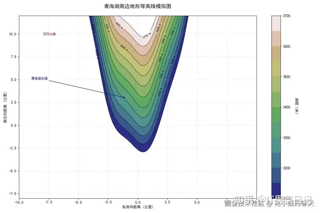 importmatplotlib.pyplotaspltfrommatplotlibimportcmimportnumpyasnpplt.rcParams['font.family']='SimHei'# 黑体支持中文plt.rcParams['axes.unicode_minus']=False# 解决负数乱码问题# 生成地形数据(模拟青海湖周边区域 20x20公里)x=np.linspace(-10,10,200)y=np.linspace(-8,12,200)X,Y=np.meshgrid(x,y)# 高程函数(包含湖盆与山脉特征)Z=3200+50*Y-40*X**2+30*np.sin(2*X)+45*np.exp(-(X**2+Y**2)/25)# 创建画布plt.figure(figsize=(12,8))# 绘制填充等高线cs=plt.contourf(X,Y,Z,levels=np.linspace(3100,3700,13),cmap=cm.gist_earth,alpha=0.85)# 绘制等高线c_lines=plt.contour(X,Y,Z,levels=np.linspace(3100,3700,13),colors='black',linewidths=0.6)# 添加标签plt.clabel(c_lines,inline=True,fontsize=8,fmt='%d m')# 添加高程标注# 添加色标cbar=plt.colorbar(cs)cbar.set_label('高程(米)',rotation=270,labelpad=20)# 设置地形图元素plt.title('青海湖周边地形等高线模拟图',pad=20,fontsize=14)plt.xlabel('东西向距离 (公里)')plt.ylabel('南北向距离 (公里)')plt.grid(linestyle=':',alpha=0.5)# 标注特征区域plt.text(-8,10,'日月山脉',ha='left',va='center',fontsize=9,color='#8B0000')plt.annotate('青海湖水域',xy=(-1,3),xytext=(-9,5),arrowprops=dict(arrowstyle="->",color='navy'),fontsize=9,color='#00008B')plt.tight_layout()plt.show()