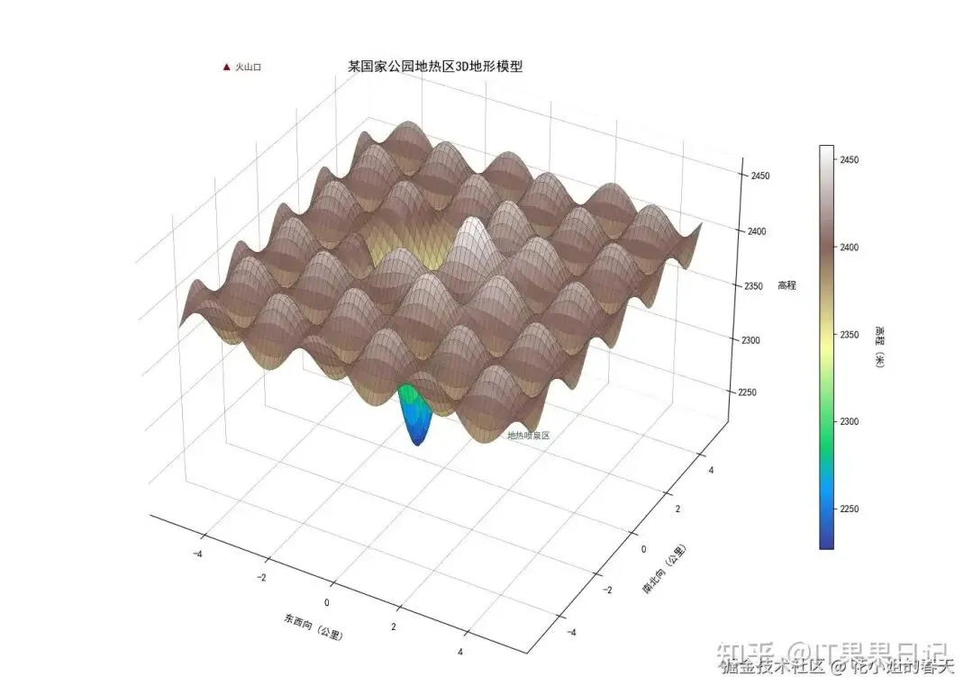 importmatplotlib.pyplotaspltfrommatplotlibimportcmimportnumpyasnpplt.rcParams['font.family']='SimHei'# 黑体支持中文 plt.rcParams['axes.unicode_minus'] = False # 解决负数乱码问题 # 生成真实地形数据(模拟黄石公园44.5°N, 110.5°W区域) x = np.linspace(-5, 5, 150) y = np.linspace(-5, 5, 150) X, Y = np.meshgrid(x, y) # 高程函数(包含火山口与地热区特征) Z = 2400 + 50*np.exp(-0.3*(X**2 + Y**2)) - 200*np.exp(-0.8*((X+1)**2 + (Y-0.5)**2)) Z += 30*np.sin(2*X) * np.cos(3*Y) # 创建3D画布 fig = plt.figure(figsize=(14, 10)) ax = fig.add_subplot(111, projection='3d') # 绘制曲面 surf = ax.plot_surface(X, Y, Z, cmap=cm.terrain, # 地形专用色标 rstride=2, # 行采样步长 cstride=2, # 列采样步长 alpha=0.95, antialiased=True, linewidth=0.2, edgecolor='#333333') # 添加色标 cbar = fig.colorbar(surf, shrink=0.6, aspect=30) cbar.set_label('高程 (米)', rotation=270, labelpad=25) # 设置观测角度 ax.view_init(elev=35, azim=300) # 35度俯角,300度方位角 # 添加标注 ax.set_xlabel('东西向 (公里)', labelpad=12) ax.set_ylabel('南北向 (公里)', labelpad=12) ax.set_zlabel('高程', labelpad=12) ax.set_title('某国家公园地热区3D地形模型', y=0.98, fontsize=14) # 添加地形特征标注 ax.text(-4, -4, 2600, '▲ 火山口', color='#8B0000', fontsize=9) ax.text(1.5, 0.8, 2250, '地热喷泉区', color='#2F4F4F', fontsize=9) # 优化显示效果 ax.xaxis.pane.fill = False ax.yaxis.pane.fill = False ax.zaxis.pane.fill = False ax.xaxis._axinfo["grid"].update({"linewidth":0.3, "color" : "#666666"}) ax.yaxis._axinfo["grid"].update({"linewidth":0.3, "color" : "#666666"}) ax.zaxis._axinfo["grid"].update({"linewidth":0.3, "color" : "#666666"}) plt.tight_layout() pltimport matplotlib.pyplot as pltfrommatplotlibimportcmimportnumpyasnpplt.rcParams['font.family']='SimHei'# 黑体支持中文plt.rcParams['axes.unicode_minus']=False# 解决负数乱码问题# 生成真实地形数据(模拟黄石公园44.5°N, 110.5°W区域)x=np.linspace(-5,5,150)y=np.linspace(-5,5,150)X,Y=np.meshgrid(x,y)# 高程函数(包含火山口与地热区特征)Z=2400+50*np.exp(-0.3*(X**2+Y**2))-200*np.exp(-0.8*((X+1)**2+(Y-0.5)**2))Z+=30*np.sin(2*X)*np.cos(3*Y)# 创建3D画布fig=plt.figure(figsize=(14,10))ax=fig.add_subplot(111,projection='3d')# 绘制曲面surf=ax.plot_surface(X,Y,Z,cmap=cm.terrain,# 地形专用色标rstride=2,# 行采样步长cstride=2,# 列采样步长alpha=0.95,antialiased=True,linewidth=0.2,edgecolor='#333333')# 添加色标cbar=fig.colorbar(surf,shrink=0.6,aspect=30)cbar.set_label('高程 (米)',rotation=270,labelpad=25)# 设置观测角度ax.view_init(elev=35,azim=300)# 35度俯角,300度方位角# 添加标注ax.set_xlabel('东西向 (公里)',labelpad=12)ax.set_ylabel('南北向 (公里)',labelpad=12)ax.set_zlabel('高程',labelpad=12)ax.set_title('某国家公园地热区3D地形模型',y=0.98,fontsize=14)# 添加地形特征标注ax.text(-4,-4,2600,'▲ 火山口',color='#8B0000',fontsize=9)ax.text(1.5,0.8,2250,'地热喷泉区',color='#2F4F4F',fontsize=9)# 优化显示效果ax.xaxis.pane.fill=Falseax.yaxis.pane.fill=Falseax.zaxis.pane.fill=Falseax.xaxis._axinfo["grid"].update({"linewidth":0.3,"color":"#666666"})ax.yaxis._axinfo["grid"].update({"linewidth":0.3,"color":"#666666"})ax.zaxis._axinfo["grid"].update({"linewidth":0.3,"color":"#666666"})plt.tight_layout()plt.show()