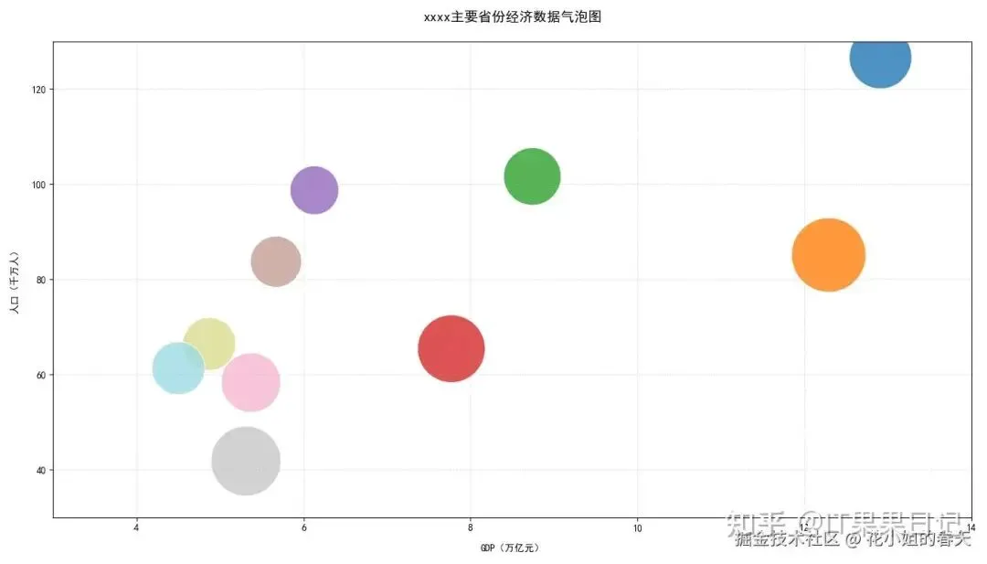 importmatplotlib.pyplotaspltimportnumpyasnpplt.rcParams['font.family']='SimHei'# 黑体支持中文plt.rcParams['axes.unicode_minus']=False# 解决负数乱码问题# 各省份数据(GDP单位:万亿元,人口单位:千万人)provinces=['广东','江苏','山东','浙江','河南','四川','湖北','福建','湖南','安徽']gdp=[12.91,12.29,8.74,7.77,6.13,5.67,5.37,5.31,4.87,4.50]population=[126.6,85.1,101.6,65.4,98.7,83.7,58.3,41.8,66.4,61.3]per_capita_gdp=[10.2,14.4,8.6,11.9,6.2,6.8,9.2,12.7,7.3,7.3]# 单位:万元/人# 创建画布plt.figure(figsize=(14,8))# 绘制气泡图scatter=plt.scatter(x=gdp,y=population,s=np.array(per_capita_gdp)*400,# 气泡大小缩放c=np.arange(len(provinces)),# 颜色映射cmap='tab20',alpha=0.8,edgecolors='white',linewidths=0.8)# 设置坐标轴plt.title('xxxx主要省份经济数据气泡图',fontsize=14,pad=20)plt.xlabel('GDP(万亿元)',labelpad=12)plt.ylabel('人口(千万人)',labelpad=12)plt.grid(linestyle=':',alpha=0.6)# 设置坐标范围plt.xlim(3,14)plt.ylim(30,130)plt.tight_layout()plt.show()