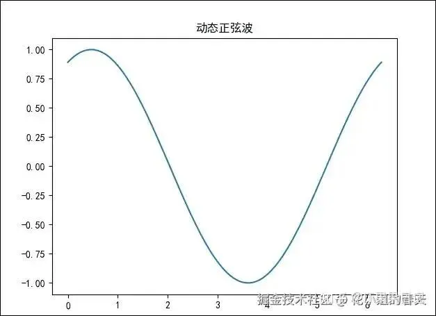importmatplotlib.pyplotaspltimportnumpyasnpfrommatplotlibimportanimationplt.rcParams['font.family']='SimHei'# 黑体支持中文plt.rcParams['axes.unicode_minus']=False# 解决负数乱码问题fig,ax=plt.subplots()x=np.linspace(0,2*np.pi,128)line,=ax.plot(x,np.sin(x))defupdate(i):line.set_ydata(np.sin(x+i/10.0))returnline,ani=animation.FuncAnimation(fig,update,frames=100,interval=50)plt.title('动态正弦波')plt.show()