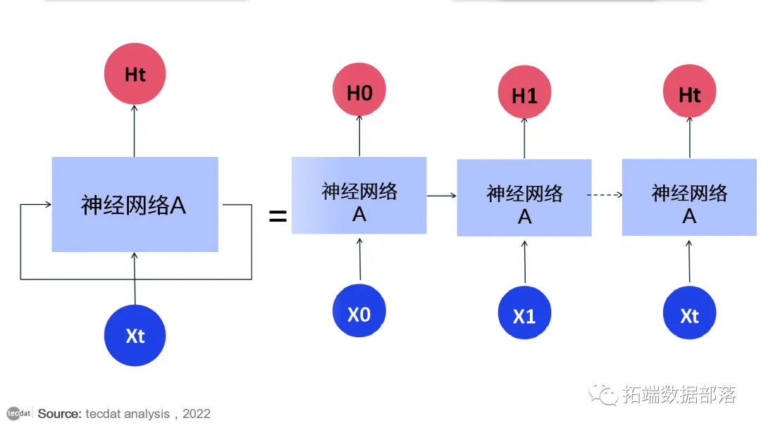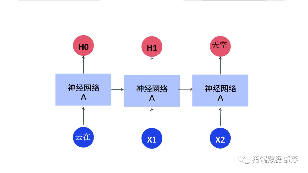 在上图中,一大块神经网络,查看一些输入x并输出一个值h. 循环允许信息从网络的一个步骤传递到下一个步骤。
