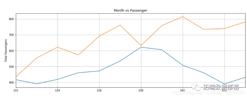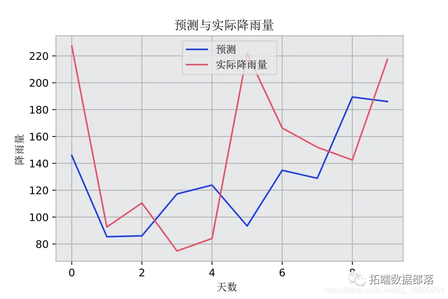 如前所述,过去10个月的降雨数据被用作测试集。然后,LSTM模型被用来预测未来10个月的情况,然后将预测结果与实际值进行比较。