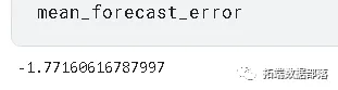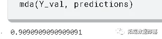 mda(Y_val, predictions)0.9090909090909091>>> mse = mean\_squared\_error(Y_val, predictions)>>> rmse = sqrt(mse)>>> forecast_error>>> mean\_forecast\_error = np.mean(forecast_error)