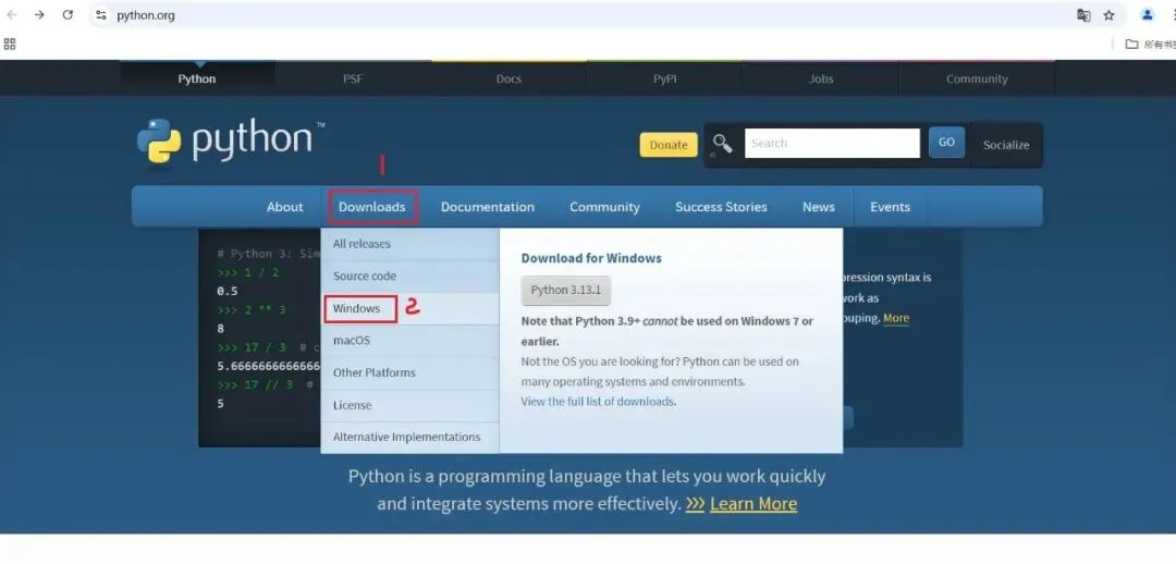 - 访问 Python 官网 ,选择Downloads下拉框点击Windows选项卡;