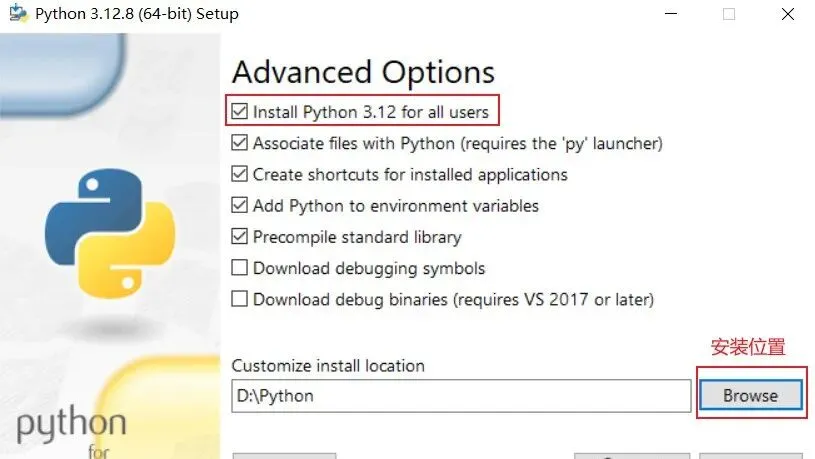 - 在安装过程中,可以选择默认安装路径,也可以自定义安装路径,我这里改成了自己设置的路径(D:\Python)。