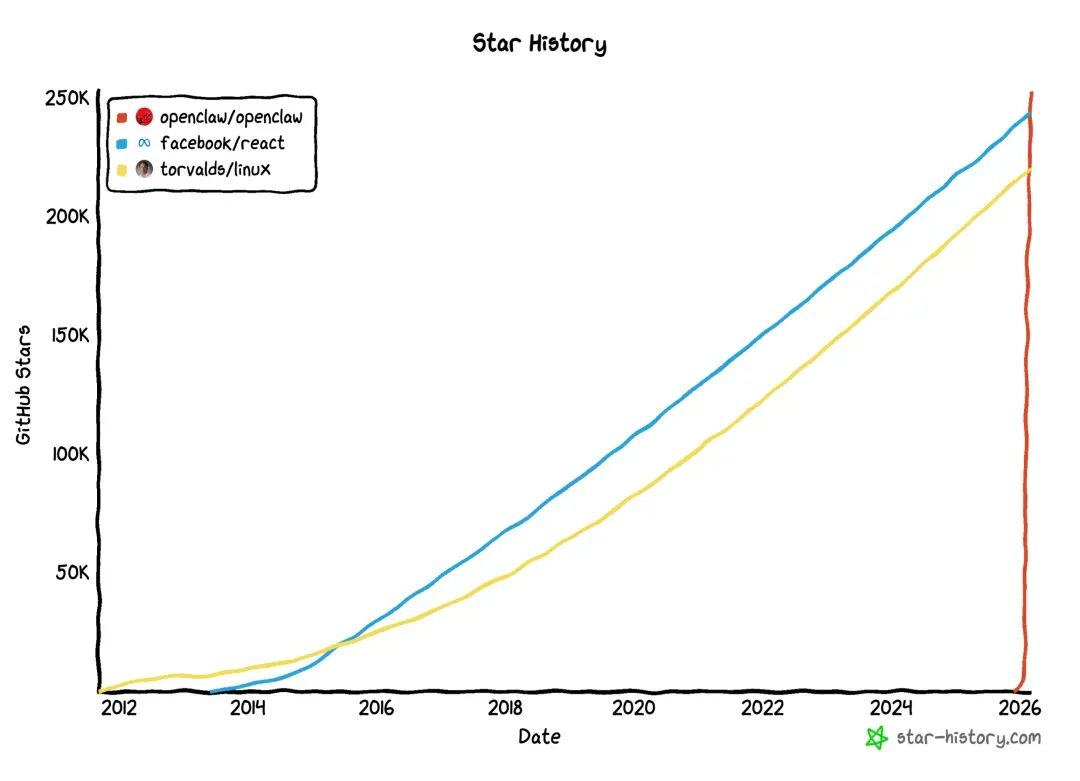 如果说 GitHub 的 Star 数是开源世界的“流量晴雨表”,那么 OpenClaw 的这次登顶,简直就是在这张表上投下了一枚原子弹。就在昨天,这个诞生仅仅四个月的 AI Agent 框架,Star 数正式超越了 Linux 内核,成为了 GitHub 历史上最受关注的软件项目。