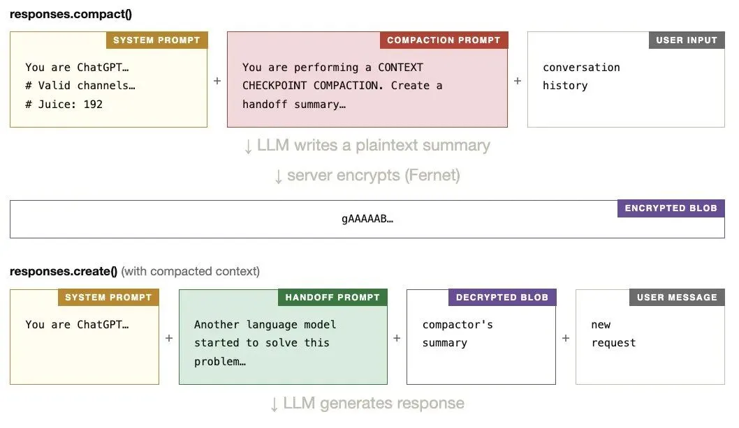 CLI 调用 compact() API,返回一个加密的 blob。你不知道它内部是不是用 LLM、用的什么 prompt、有没有 handoff prompt——全是个黑盒。
