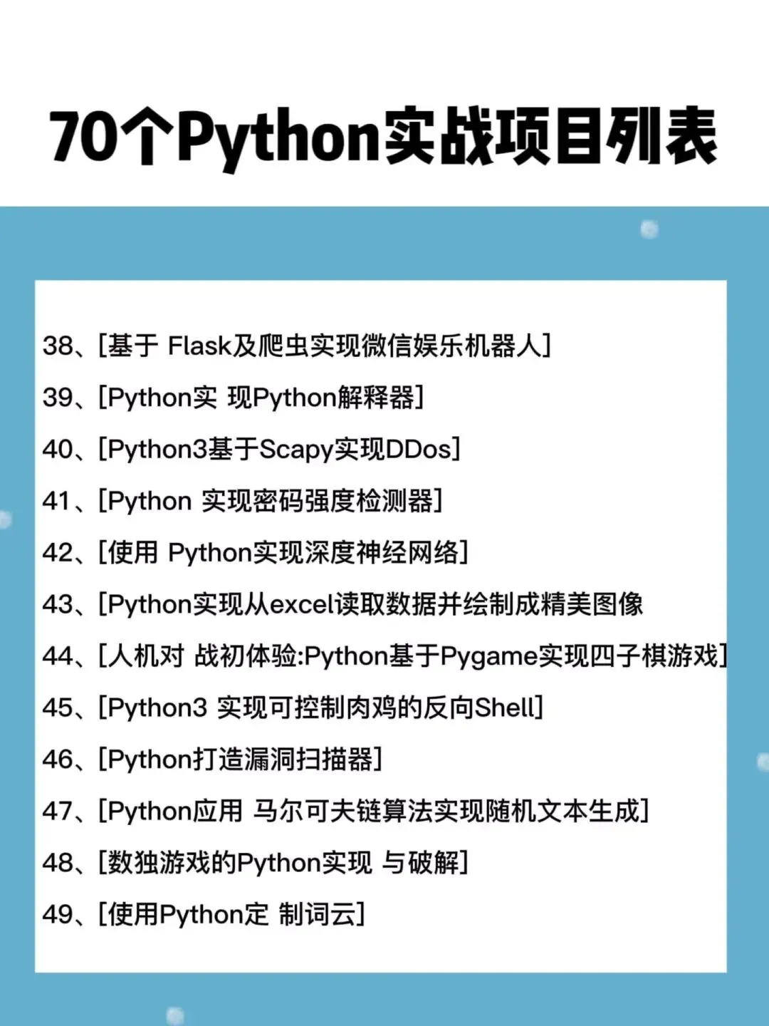 学习Python,70个Python实战项目,助力自我提升!内容包含爬虫项目、数据分析项目、机器学习、深度学习。这70个Python实战项目,你可以挑选感兴趣的进行参考、练习与学习,也能从中获取思路,打造属于自己的项目!在他人松懈的时间里,自己练完这70个Python实战项目,轻松成长之路!