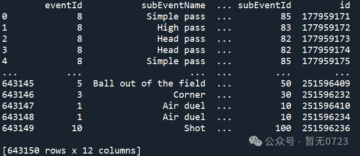 path = os.path.join(str(pathlib.Path().resolve()), 'data', 'Wyscout','datas', 'events_England.json')with open(path) as f: data = json.load(f)train = pd.DataFrame(data)path = os.path.join(str(pathlib.Path().resolve()),"data", 'Wyscout', 'players.json')#open dataset with playerswith open(path) as f: players = json.load(f)player_df = pd.DataFrame(players)print(train)#可以print出来看一下是否能正常加载数据,print(train)则是展示事件数据#print(player_df)则是展示球员信息数据