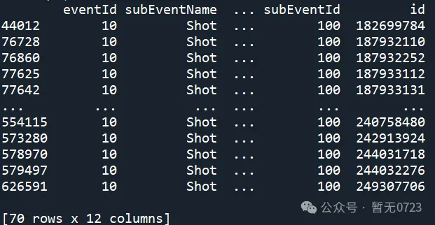 数据能够正常打开,那么紧接着进行数据的筛选。在这里,我们事件数据里选择'Shot'(注意大小写),球员选择'Son Heung-Min'并且和球员id即'wyID'关联起来。最后再在shots变量里找到son的id,最后可以print一下检查下数据。