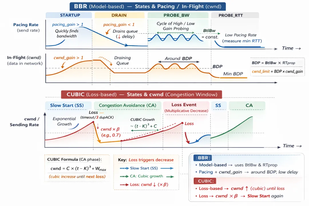 模型驱动:不依赖”丢包=拥塞”,而是在线估计两个参数:瓶颈带宽 BtlBw 和 最小 RTT(RTprop)。控制发送速率使在途数据量接近 带宽-延迟积(BDP)。