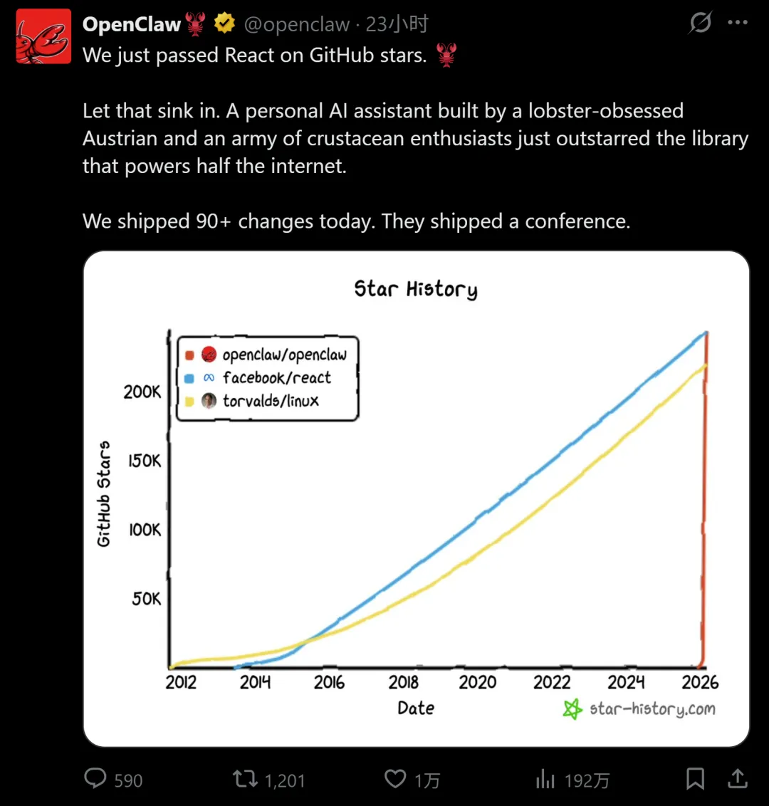 前端领域极其庞大的 React 项目,攒下 24 万多颗星足足用了十多年,而支撑起今天半个互联网的 Linux,从 1991 年敲下第一行代码到现在,也不过维持在二十多万的量级。