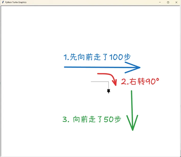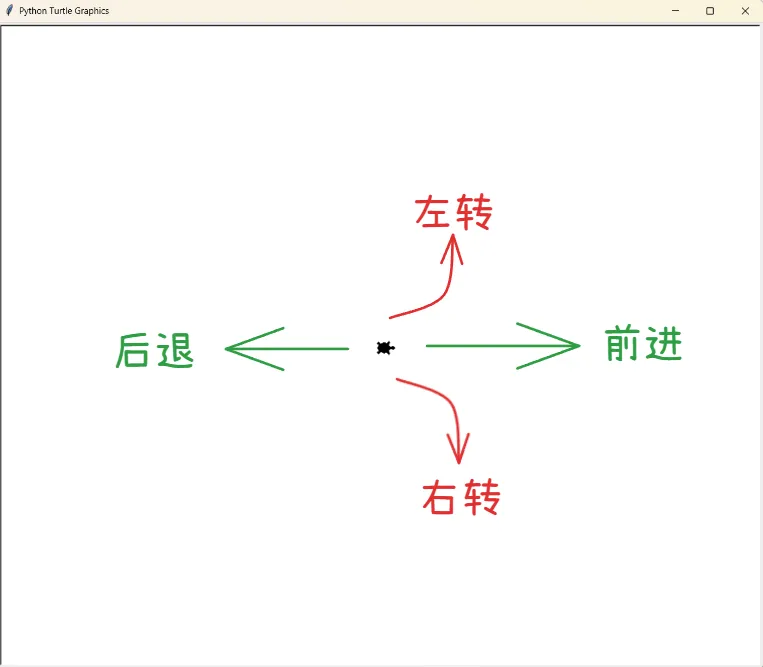 forward(x):向前走 x 像素backward(x):向后走 x 像素right(angle):右转 angle 度left(angle):左转 angle 度这些命令组合起来,就能让海龟在屏幕上“跳舞”。