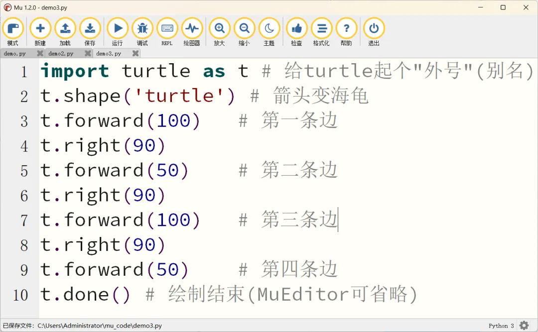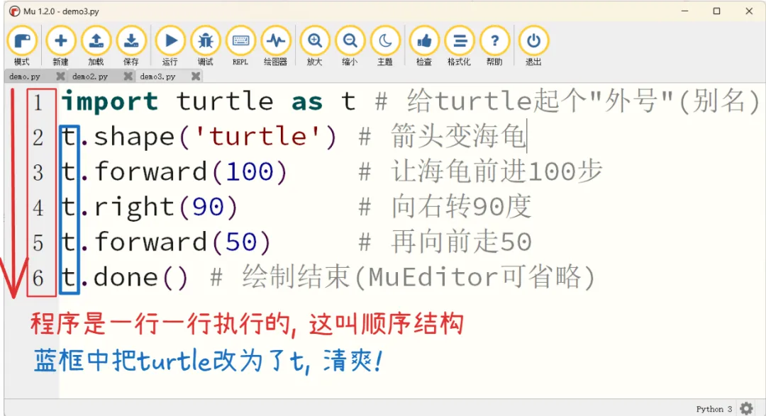 这次我们让海龟先走,再转,再走! 为了稍微偷点懒, 我们给turtle起个"外号"叫t, 这样就可以把turtle的地方改用t来编写了!