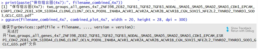 Error in grDevices::pdf(file = filename, ..., version = version): 无法打开 'two_groups_page_1_ZNF398_ZEB2_TGFB1_TGFB2_TGFB3_NODAL_SMAD1_SMAD5_SMAD2_SMAD3_CDH1_EPCAM_ESRP1_CDH2_ZEB1_VIM_S100A4_CLDN6_CLDN7_OCLN_PODXL_INHBA_ACVR1_ACVR2A_ACVR2B_ACVR1B_CGN_SOX15_NFE2L2_TXNRD2_TXNRD3_SOD3_GCLC_GSS.pdf' 文件文件明明没被打开啊?!文件夹也有写入权限啊?!我一度怀疑是 Windows Defender 在搞鬼,或者 RStudio 抽风了。后来才发现,罪魁祸首是文件名 + 路径总长度超出了 Windows 的“铁律”——260 字符。