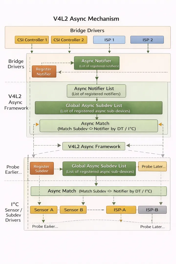 本文从设计动机、核心结构、匹配机制、时序流程、多 ISP 扩展到常见陷阱,系统解析 V4L2 async 机制。