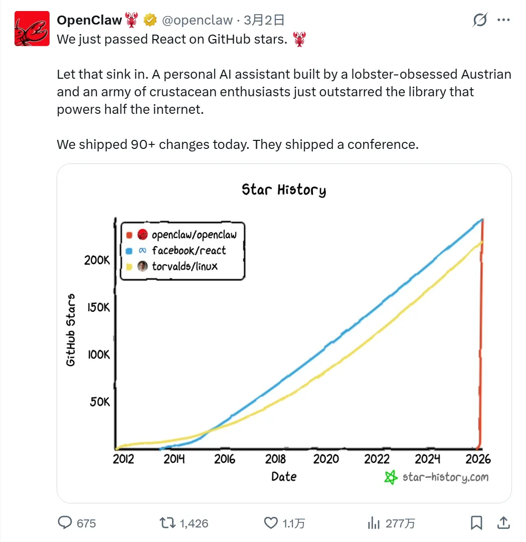 2022年至今,AI时代。从AutoGPT到LangChain,再到OpenClaw,收割星标的速度越来越快。