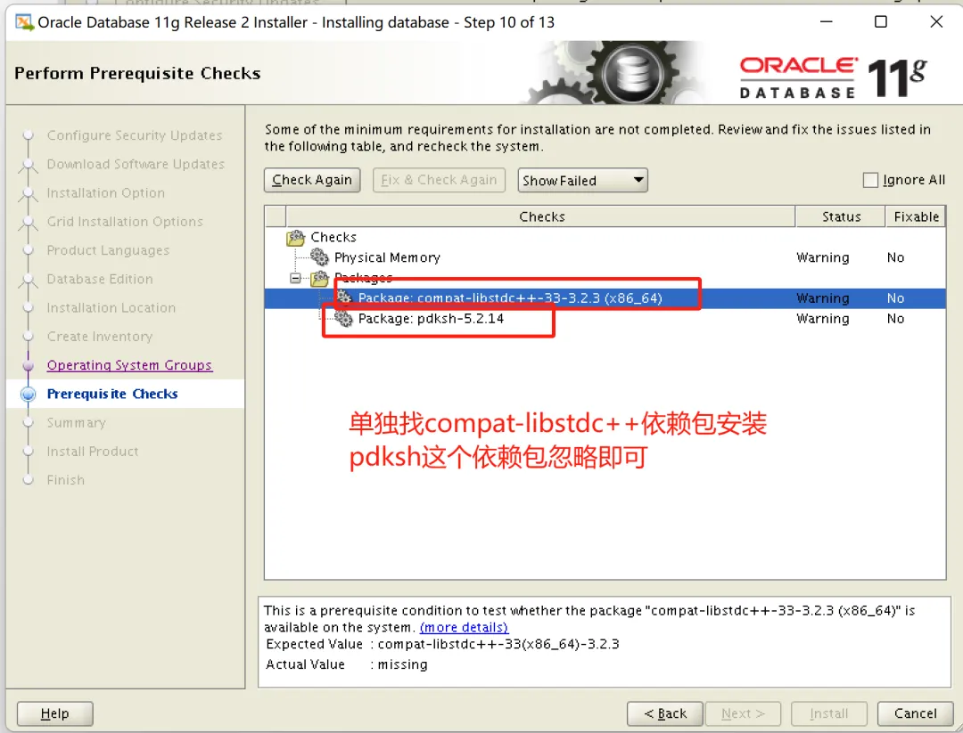问题总结:一、rpm -ivh compat-libstdc++-33-3.2.3-72.el7.x86_64.rpm备注:linux7版本需要单独安装上面这个rpm包,网上下载即可,否则在安装检查依赖包阶段时会提示缺失这个rmp包二、linux7版本安装oracle11g,图形界面安装会出现ins_emagent.mk报错提示,解决方法如下:主要因为C库的问题,解决办法就是手动指定C库位置su - oracle1、备份$ORACLE_HOME/sysman/lib/ins_emagent.mk文件cp $ORACLE_HOME/sysman/lib/ins_emagent.mk /home/oracle/ins_emagent.mk_$(date +%F)2、出现agent nmhs问题后,找到$ORACLE_HOME/sysman/lib/ins_emagent.mk文件,在文件里找字符串(可通过/ 查询MK_EMAGENT_NMECTL)$(MK_EMAGENT_NMECTL)替换为$(MK_EMAGENT_NMECTL) -lnnz11 注意:lnnz和$(MK_EMAGENT_NMECTL)之间有空格, 第一个是字母l 后面两个是数字1或者使用下面命令修改 sed -i 's/^\(\s*\$(MK_EMAGENT_NMECTL)\)\s*$/\1 -lnnz11/g' $ORACLE_HOME/sysman/lib/ins_emagent.mk然后点"重试"按钮就可以了三、Oracle11g默认的sga内存大小需要1200M以上,否则安装报错