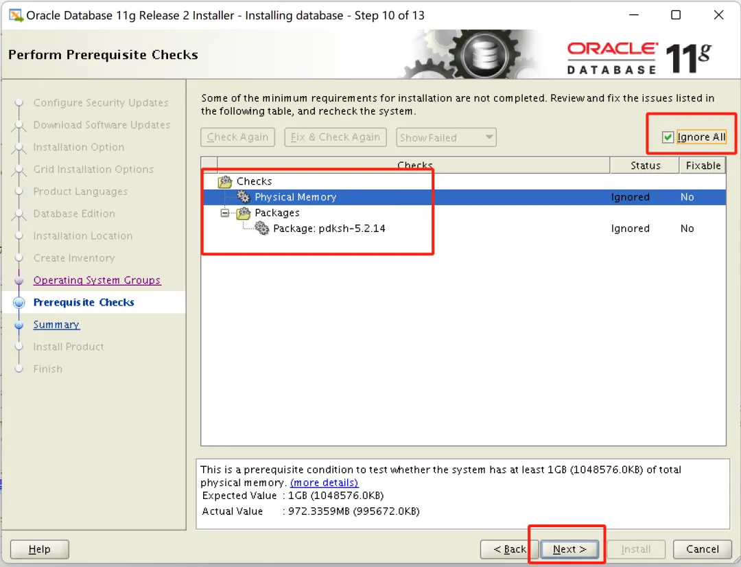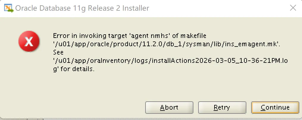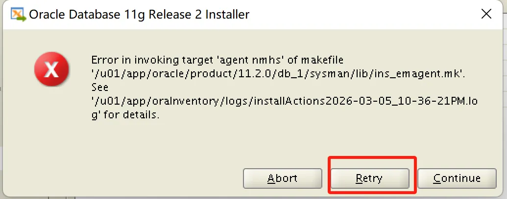 linux7版本安装oracle11g,图形界面安装会出现ins_emagent.mk报错提示,解决方法如下:主要因为C库的问题,解决办法就是手动指定C库位置su - oracle1、备份$ORACLE_HOME/sysman/lib/ins_emagent.mk文件cp $ORACLE_HOME/sysman/lib/ins_emagent.mk /home/oracle/ins_emagent.mk_$(date +%F)2、出现agent nmhs问题后,找到$ORACLE_HOME/sysman/lib/ins_emagent.mk文件,在文件里找字符串(可通过/ 查询MK_EMAGENT_NMECTL)$(MK_EMAGENT_NMECTL)替换为$(MK_EMAGENT_NMECTL) -lnnz11 注意:lnnz和$(MK_EMAGENT_NMECTL)之间有空格, 第一个是字母l 后面两个是数字1或者使用下面命令修改 sed -i 's/^\(\s*\$(MK_EMAGENT_NMECTL)\)\s*$/\1 -lnnz11/g' $ORACLE_HOME/sysman/lib/ins_emagent.mk然后点"重试"按钮就可以了