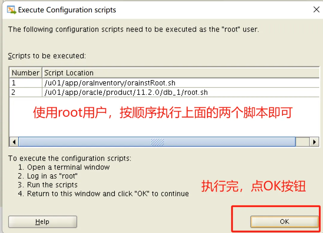 执行脚本的输出如下:[root@host01 ~]# /u01/app/oraInventory/orainstRoot.sh/u01/app/oracle/product/11.2.0/db_1/root.shChanging permissions of /u01/app/oraInventory.Adding read,write permissions for group.Removing read,write,execute permissions for world.Changing groupname of /u01/app/oraInventory to oinstall.The execution of the script is complete.[root@host01 ~]# /u01/app/oracle/product/11.2.0/db_1/root.shPerforming root user operation for Oracle 11g The following environment variables are set as: ORACLE_OWNER= oracle ORACLE_HOME= /u01/app/oracle/product/11.2.0/db_1Enter the full pathname of the local bin directory: [/usr/local/bin]: --这个地方直接回车按钮即可 Copying dbhome to /usr/local/bin ... Copying oraenv to /usr/local/bin ... Copying coraenv to /usr/local/bin ...Creating /etc/oratab file...Entries will be added to the /etc/oratab file as needed byDatabase Configuration Assistant when a database is createdFinished running generic part of root script.Now product-specific root actions will be performed.Finished product-specific root actions.
