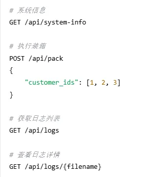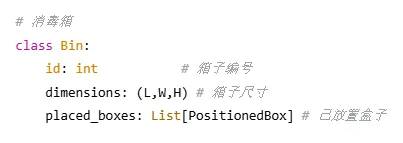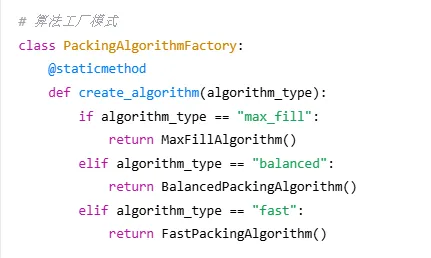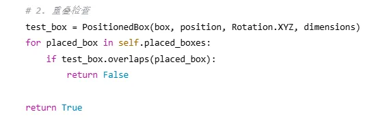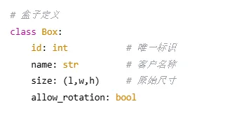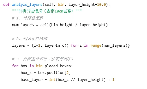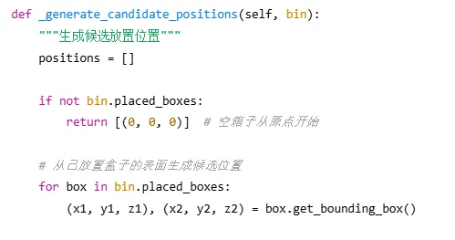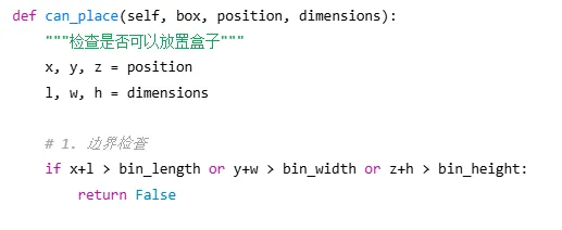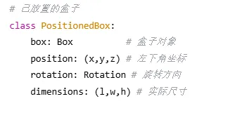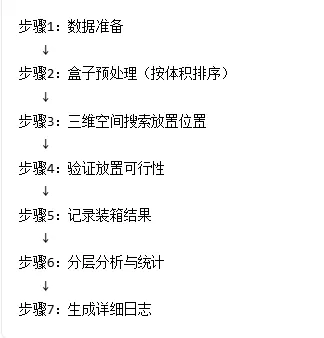 def pack(self, boxes, bin_dimensions): #1. 按体积从大到小排序(启发式策略) boxes_sorted= sorted(boxes, key=lambda b: -b.volume()) #2. 初始化箱子列表 bins= [] #3. 遍历所有盒子 forbox in boxes_sorted: placed= False #4. 优先尝试放入已有箱子 forbin in bins: ifself._try_place_in_bin(bin, box): placed= True break #5. 创建新箱子 ifnot placed: new_bin= Bin(id=len(bins)+1, dimensions=bin_dimensions) ifself._try_place_in_bin(new_bin, box): bins.append(new_bin) placed= True #6. 处理无法放置的盒子 ifnot placed: print(f"警告:无法放置盒子 {box.name}") returnbins |