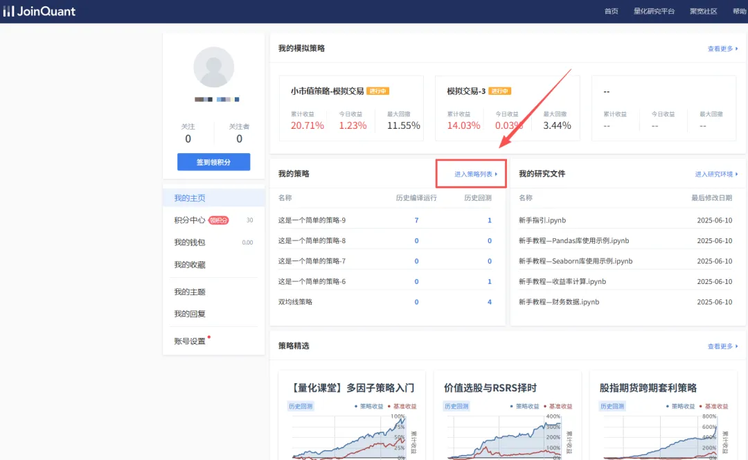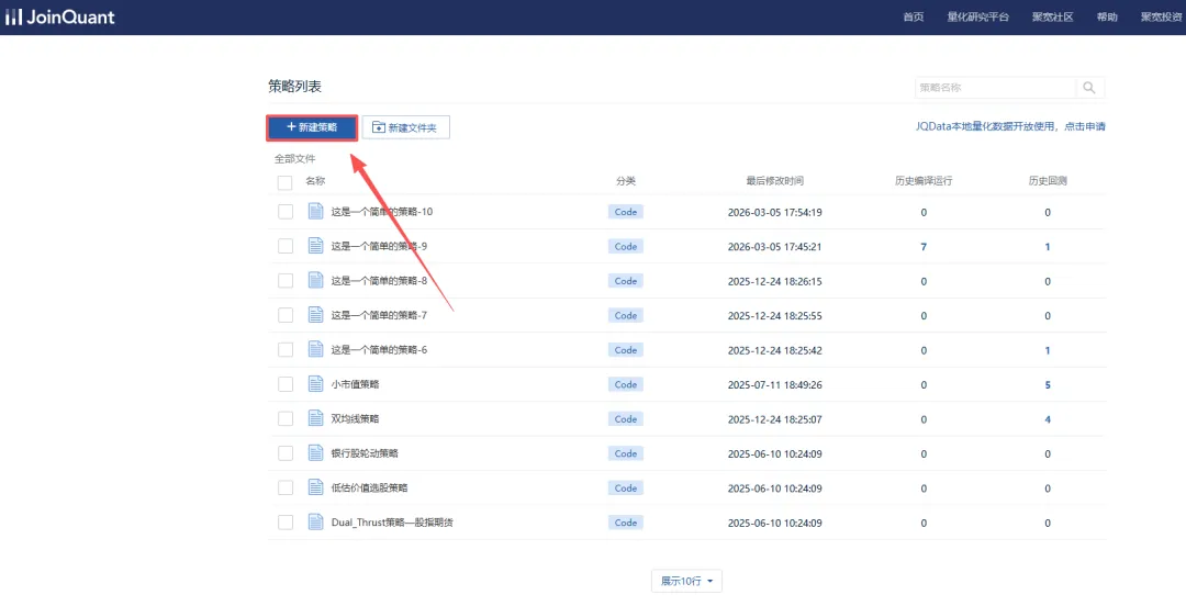 首先进入聚宽JoinQuant量化交易平台的首页页面。然后在菜单栏中找到“我的策略”,点击旁边的【进入策略列表】,点击新建策略,命名为“双均线量化策略”。